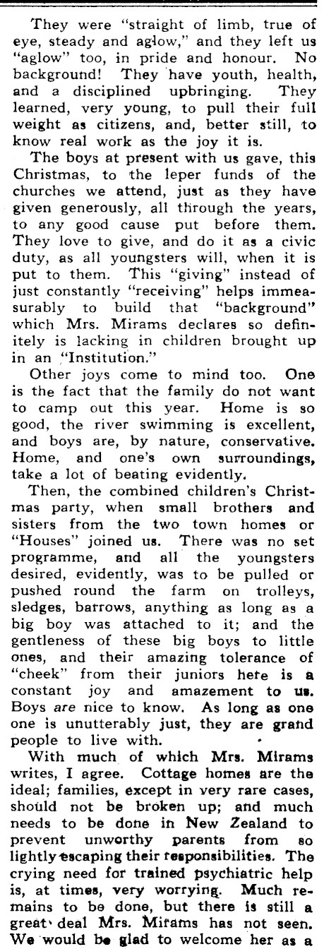 They were "straight of limb, true of eye, steady and aglow," and they left us "aglow" too, in pride and honour. No background! ‘They ‘have youth, health, and a disciplined upbringing. They learned, very young, to pull their full weight as citizens, and, better still, to know real work as the joy it is. The boys at present with us gave, this Christmas, to the leper funds of the churches we attend, just as they have given generously, all through the years, to any good cause put befofe them. They love to give, and do it as a Givic duty, as all youngsters will, when it is put to them. This "giving" instead of just constantly "receiving" helps immeasurably to build that "background" which Mrs. Mirams declares so defifiitely is lacking in children brought up in an "Institution." Other joys come to mind too. One is the fact that the family do hot want to camp out this year. Home is so good, the river swimming is excellent, and boys are, by nature, conservative. Home, and one’s own surroundings, take a lot of beating evidently. Then, the combined children’s Christmas party, when small brothers and sisters from the two town homes or "Houses" joined us. There was no set programme, and all the youngsters desired, evidetitly, was to be pulled or pushed round the farm on_ trolleys, sledges, bafrows, anything as long as a big boy was attached to it; and the gentleness of these big boys to little ones, and their amazing tolerance of "cheek" from their juniots hete is a constant joy and amazement to us. Boys are nice to know, As long as one one is ufutterfably just, they a grand people to live with. With much of which Mrs. Siidine writes, I agree. Cottage homes are the ideal; families, except in very rare cases, should not be broken up; and much needs to be done in New Zealand to prevent unworthy parents from so lightly escaping their tesponsibilities. The crying need for trained psychiatric help is, at times, very worrying. Much remains to be done, but there is still a great» deal Mrs. Mifams has not seen, We would be glad to welcome her as a