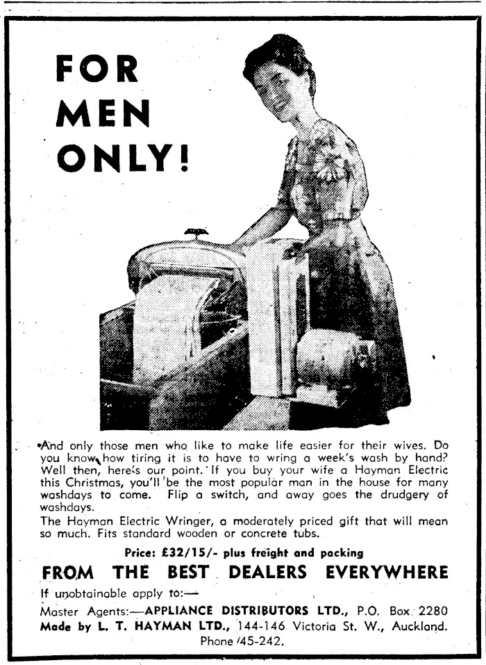FOR MEN ONLY! 'And on ly those men who like to make life easier for their wives. Do you know how tiring it is to have to wring a week's wash by hand? Well then; here's our point. If you buy your wife a Hayman Electric this Christmas, you I be the most popular man in the house for many washdays to come. Flip a switch, and away goes the drudgery of washdays: The Hayman Electric Wringer, a moderately priced gift that will mean SO much. Fits standard wooden or concrete tubs. Price: E32/15 /- plus freight and packing FROM THE BEST DEALERS EVERYWHERE If unobtainable apply to: Master Agents: ~APPLIANCE DISTRIBUTORS LTD , P 0 Box 2280 Made by L: T. HAYMAN LTD:, 144-146 Victoria St. W Auckland: Phone 45-242