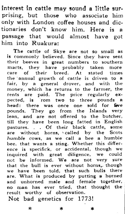 interest in cattle may sound a little surprising, but those who associate him only with London coffee houses and dictionaries don’t know him. Here is a passage that would almost have got him into Ruakura: 5 The cattle of Skye are not go small as is commonly believed. Since they have sent their beeves in great numbers to southern marts, they have probably taken more care of their breed. At stated times the ‘annual growth of cattle is driven to a fair, by a general drover, and with the money, which he.returns to the farmer, the rents are paid, The price regularly expected, is ‘rom two to three pounds a head: there was once one sold for fwe pounds. They go from the Islands very lean, and are not offered to the butcher, till they have been long fatted in English pastures. . . Of their black cattle, some are without horns, ‘called by. the Scots humble cows, as we call a bee a humble bee, that wants a sting. Whether this difference is specifick, or accidental, though we inquired with great diligence, we could not be informed. We are not very sure that the bull is ever without horns, though we have been told, that such bulls there are, What is produced by putting a horned and unhorned male and female together, no man has ever tried, that thought the result worthy of observation. Not bad genetics for 1773! mw * Ba
