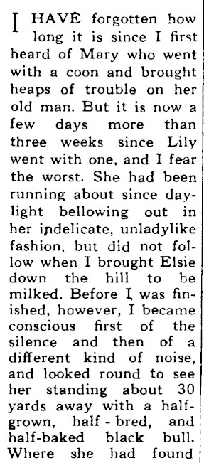 HAVE forgotten how long it is since I first heard of Mary who went with a coon and brought heaps of trouble on her old man. But it is now a few days more _ than three weeks since Lily went with one, and I fear the worst. She had been running about since daylight bellowing out in her indelicate, unladylike fashion, but did not follow when I brought Elsie down the hill to be milked. Before I was finished, however, I became conscious first of the silence and then of a different kind of noise, and looked round to see her standing about 30 yards away with a halfgrown, half-bred, and half-baked black bull. Where she had found