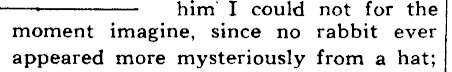 him I could not for the moment imagine, since no rabbit ever appeared more mysteriously from a hat;