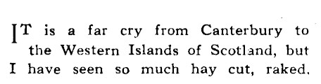 T is a far cry from Canterbury to. the Western Islands of Scotland, but I have. seen so much hay cut, raked,