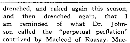 drenched, and raked again this season, and then drenched again, that I am reminded of what Dr. Johnson called the "perpetual perflation" contrived by Macleod of Raasay. Mac-