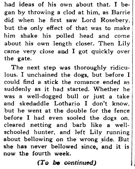 had ideas of his own about that. I began by throwing a clod at him, as Barrie did when he first saw Lord Rosebery, but the only effect of that was to make him shake his polled head and come about his own length closer. Then Lily came very close and I got quickly over the gate. The next step was thoroughly ridiculous. I unchained the dogs, but before I could find a stick the romance ended as suddenly as it had started. Whether he was a well-dogged bull or just a take and skedaddle Lothario I don’t know, but he went at the double for the fence before I had even sooled the dogs on, cleared netting and barb like a wellschooled hunter, and left Lily running | about bellowing on the wrong side. But | | she has never bellowed since, and it is now the fourth week. (To be continued)