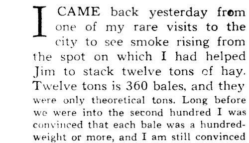 CAME back yesterday from one of my rare visits to the city to see smoke rising from the spot on which I had helped Jim to stack twelve tons of hay. Twelve tons is 360 bales, and they were only theoretical tons. Long before we were into the second hundred I was convinced that each bale was a hundredweight or more, and I am still convinced