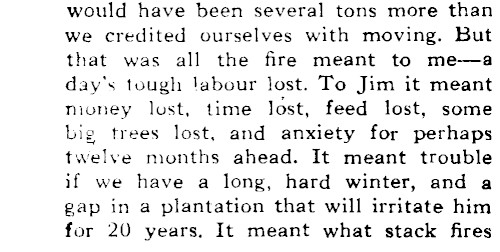 would have been several tons more than we credited ourselves with moving. But that was all the fire meant to me-a day’s tough labour lost. To Jim it meant ‘money lost, time lost, feed lost, some big trees lost, and anxiety for perhaps twelve months ahead. It meant trouble if we have a long, hard winter, and a gap in a plantation that will irritate him for 20 years, It meant what stack fires