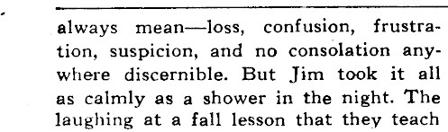 always mean-loss, confusion, frustration, suspicion, and no consolation anywhere discernible. But Jim took it all as calmly as a shower in the night. The laughing at a fall lesson that they teach