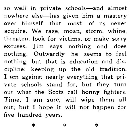 so well in private schools-and almost nowhere else-has given him a mastery over himself that most of us never acquire. We rage, moan, storm, whine, threaten, look for victims,.or make sorry excuses. Jim says nothing and does nothing. Outwardly he seems to feel nothing, but that is education and discipline: keeping up the old tradition. I am against nearly everything that private schools stand for, but they turn out what the Scots call bonny fighters. Time, I am sure, will wipe them all out; but I hope it will not happen for five hundred years. * * *