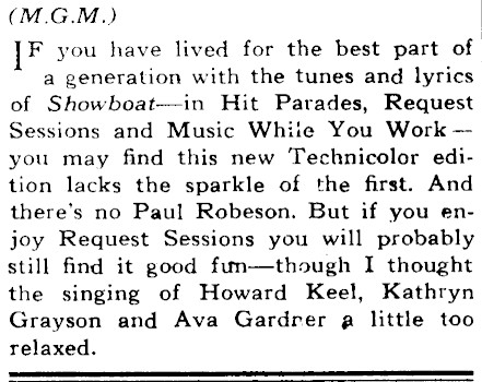 (M.G.M.) F you have lived for the best part of a generation with the tunes and lyrics of Showboat-in Hit Parades, Request Sessions and Music Whiie You Work — you may find this new Technicolor edition lacks the sparkle of the first. And there’s no Paul Robeson. But if you enjoy Request Sessions you will probably still find it good fun-though I thought the singing of Howard Keel, Kathryn Grayson and Ava Gardrer a little too relaxed.