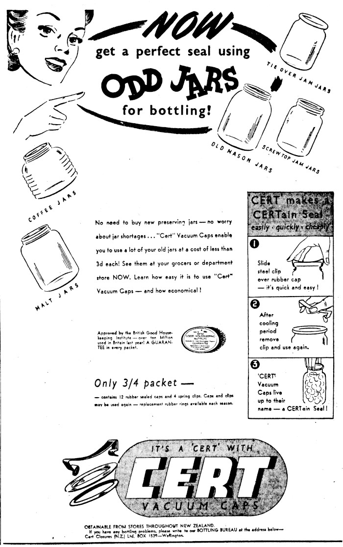Now get a perfect seal using ODD JARS for bottling} CERT makey 8 CERTain Seat No need to buy new preserving jars no woity eastly quickiy * cieo about jar shortages _ "Cert" Vacuum Caps enable You to use 8 lot of Your old jars at 0 cost of less than 3d eachl See them at your grocers Or department Slide steel clip store NOw: Learn how easy #t is to us8 "Cert" over rubber cap and how economical 1 #s quick and easy Vacuum Caps After cooling Approved by te British Good Housee LETEA period keeping Institute over ten Million Good NstiuteehnG remove used in Britein last yearl GUARAN: GUARANTE TEE in svery Packet, clip and use again: CERT' Only 3/4 packet Vacuum coateias 12 rubber sealed eps and spring clips: Caps and dips Caps live Mey be used again replacement rubber rings available each seeson UP t0 their name CERTain Seal ! IT' S A CERT WiTh CerT VA C U U M CAP S OBTAINABLE FROM STORES THROUGHOUT NEW ZEALAND: e You Reve 85y bottling problems; please write to 60 BOTTLING BUREAU 4t the address belov _ Cert Closures Nz) Ltd; BOX 1539_~Wellington Tie 0v eR JAm Jars 0 L D Screw MAs 0 N- Top JaM JA R $ JaRS J^ R $ C0 F F E E R $ J A Malt lh
