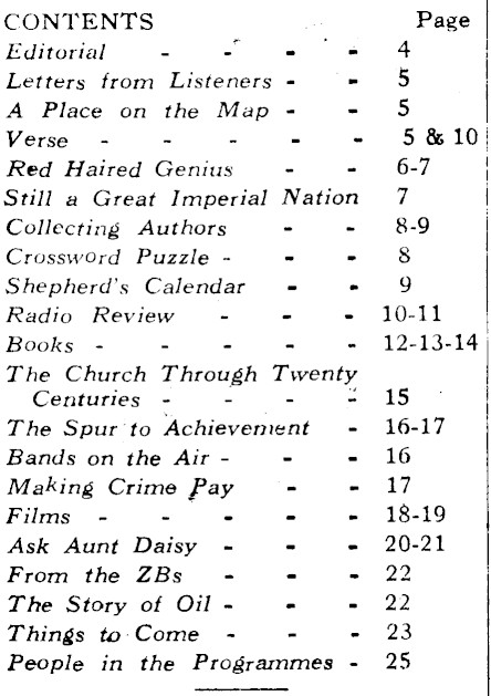 CONTENTS Sn nein Page Editorial on ties . 4 Letters from Listeners ‘* 5 A Place on the Map o *S§ Verse 58&10 Red Haired Genius 6-7: Still a Great Imperial Nation 7 Collecting Authors = 8-9 Crossword Puzzle o 8 Shepherd’s Calendar = » 9 Radio Review’ = 10-11 Books = 12-13-14 The Church Through Tents Centuries 15 The Spur‘to 16-17 Bands on the Air 16 Making Crime Pay = 17 Films -* 18-19 Ask Aunt Daisy + «= 20-21 _- From the ZBs_ | The Story of Oil as 2 Things to'Come 23 People in the Programmes 25