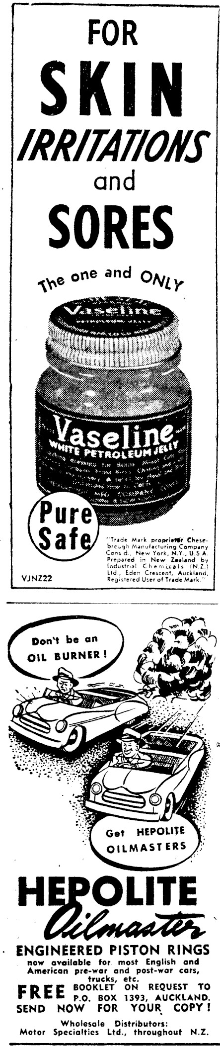 FOR SKIN IRRITATIONS and SORES one and ONLY Vessure Wunt Vaseline Prtroleum Pure Safe Trade Mark proprieter Chese brough Manufacturing Company Cons ds New York, N Y U.S A Prepared n New Zealand by Industrial Chemical $ (Nz Ltd: Eden Crescent; Auckland VJNZ22 Registered User 0f Irade Mark Don be an oil BURNER ! Get HEPOLITE OILMASTERS HeOuE ENGINEERED PISTON RINGS now available for most English and American pre-war and Post-wor cars, trucks, ete_ BookLET ON REQUEST To FREE R.o. BOX 1393, AUCKLAND SEND Now FOR YOUR COPY Wholesale Distributors: Motor Specialtics Ltd:, throughout NZ The eliy