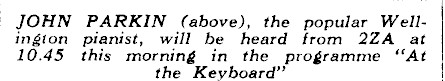 JOHN PARKIN (above), the popular Wellington pianist, will be heard from 2ZA at 10.45 this morning in the programme "At the Keyboard"