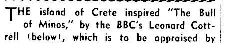 rHE island of Crete inspired ‘The Bull | of Minos," by the BBC’s Leonard Cottrell (below), which is to be appraised by