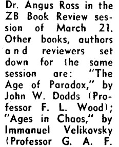 Dr. Angus Ross in the ZB Book Review session of March 21. Other books, authors ‘and reviewers. set down for the same session are: "The Age of Paradox," by John W. Dodds (Professor F. L. Wood); "Ages in Chaos," by Immanuel Velikoysky (Professor G. A. F.