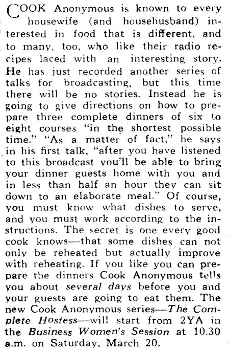 "OOK Anonymous is known to every housewife (and househusband) interested in food that is different, and to many, too, who like their radio recipes laced with an _ interesting story. He has just recorded another series of talks for broadcasting, but this time there will be no stories. Instead he is going to give directions on how to prepare three complete dinners of six to eight courses "in the shortest possible time." "As a matter of fact," he says _in his first talk, "after you have listened to this broadcast you'll be able to bring your dinner guests home with you and in less than half an hour they can sit down to an elaborate meal." Of course, you must know what dishes to serve, and you must work according to the instructions. The secret is one every good . cook knows-that some dishes can not only be reheated but actually improve with reheating. If you like you can prepare the dinners Cook Anonymous tells you about several days before you and your guests are going to eat them. The néw Cook Anonymous series-T he Complete Hostess-wil! start from 2YA in the Business Women’s Session at 10.30 a.m. on Saturday, March 20. ;