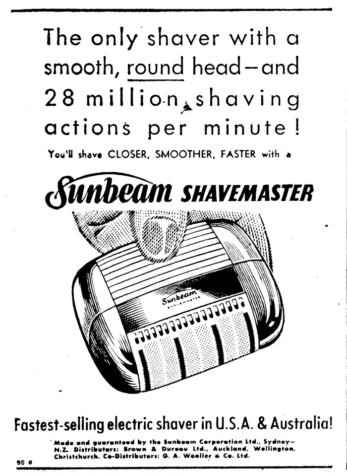 The only shaver with a smooth, round head ~ and 2 8 million shaving actions per minute 4 You'U shave CLOSER, SMOOTHER, FASTER with 0 Sunbeam SHAVEMASTER s4 Fastest-selling electric shaver in USA: & Australial Made and guarenteed By the Sunbeam Corporation Ltd: Sydney- AZ Distribufers: Btown & Duredu Lrd:, Auckland, Weliington; Christchurch: Co-Distributers: 6. As Wooller Co: Ltd: s5 8 {7777777777777777;