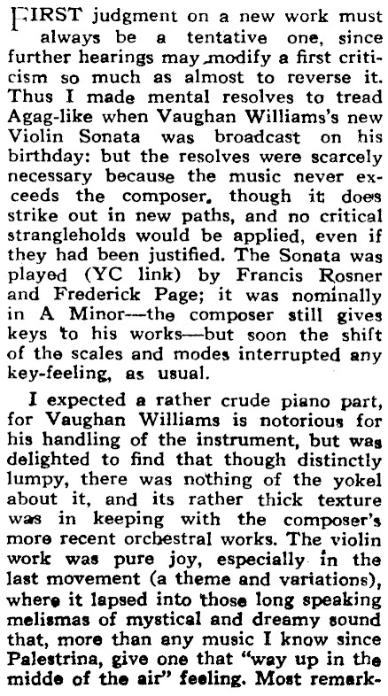 -IRST judgment on a new work must always be a tentative one, since further hearings may modify a first criticism so much as almost to reverse it. Thus I made mental resolves to tread Agag-like when Vaughan Williams’s new Violin Sonata was broadcast on his birthday: but the resolves were scarcely necessary because the music never exceeds the composer, though it does strike out in new paths, and no critical strangleholds would be applied, even if they had been justified. The Sonata was played (YC link) by Francis Rosner and Frederick Page; it was nominally in A Minor-the composer still gives keys to his works-but soon the shift of the scales and modes interrupted any key-feeling, as usual. I expected a rather crude piano part, for Vaughan Williams is notorious for his handling of the instrument, but was delighted to find that though distinctly lumpy, there was nothing of the yokel about it, and its rather thick texture was in keeping with the composer’s more recent orchéstral works. The violin work was pure joy, especially. in the last movement (a theme and variations), where it lapsed into those long speaking melismas of mystical and dreamy sound that, more than any music I know since Palestrina, give one that "way up in the midde of the air" feeling. Most remark-