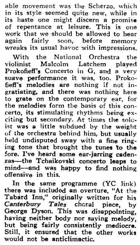 able movement was the Scherzo, which in its style seemed quite new, while in its haste one might discern a promise of repentance at leisure. This is one work that we should be allowed to hear again fairly soon, before memory wreaks its usual havoc with impressions, With the National Orchestra the violinist Malcolm Latchem played Prokofieff’s Concerto in G, and a very suave performance it was, too. Prokofieff’s melodies are nothing if not ingratiating, and there was nothing here to grate on the contemporary ear, for the melodies form the basis of this concerto, its stimulating rhythms being exciting but secondary, At times the solcist was a little subdued by the weight of the orchestra behind him, but usually held undisputed sway with a fine ringing tone that brought the tunes to the fore. I’ve heard some ear-jarring caden-zas-the Tchaikovski concerto leaps to mind--and was happy to find nothing offensive in this, In the same programme (YC link) there was included an overture, "At the Tabard Inn," originally written for his Canterbury Tales choral piece, by George Dyson. This was disappointing, having neither body nor saying melody, but being fairly consistently mediocre. Still, it ensured that the other works would not be anticlimactic.