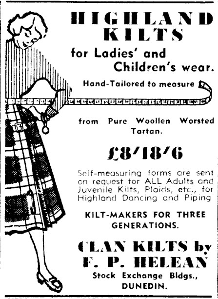 IIG HLA N I KILTS for Ladies and Children's wear. Hand-Tailored to measure DeW KitIc from Pure Woollen Worsted Tartan. S8'[8' 6 Self-measuring forms are sent on request for ALL Adults and Juvenile Kilts, Plaids, etc:, for Highland Dancing and Piping KILT-MAKERS FOR THREE GENERATIONS: CLAN KILTS by F. P. HELEAN Stock Exchange Bldgs , DUNEDIN: