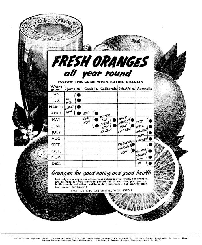 FRESH ORANGES all year round FOLLOW THIS GUIDE WHEN BUYING ORANGES Where grown Jamaica Cook Is. California SthAfrica Australia JAN: FEB Leull MARCH Isuprly ) APRIL iNoW [euv MAY [zhese Wwoch ( Nvuicv_ ~NOW These twaveis Julcy JUNE [uuick , Iavel JULY Tnavels Forawees} ~noW AUG LAalueyd_ SEPT Vvawencse OCT. _NOW VALencif NOV. ToRNGES) NOW DEC: In Oranges for good eating and good heallh Not only are oranges one of the most delicious of all fruits, but oranges are So good for You packed full of vitamins, protopectins, bioflavonoids and other riteealth-Baifaeag substances: Eat oranges often for flavour, for health 4 FRUIT DISTRIBUTORS LIMITED WELLINGTON: Printed et the Registered Office of WILSON 8 HoRTON, LTD , 149 Queen Street, Auckland, and published for the New Zealand Broadcasting Service, at Hope Gibbons Building, Inglewood Place, Wellington, by H. Sellens 9 Seaforth Terrace, Wellington, April 5 1957 NOW IAVAILABLE JAVAILABLE)