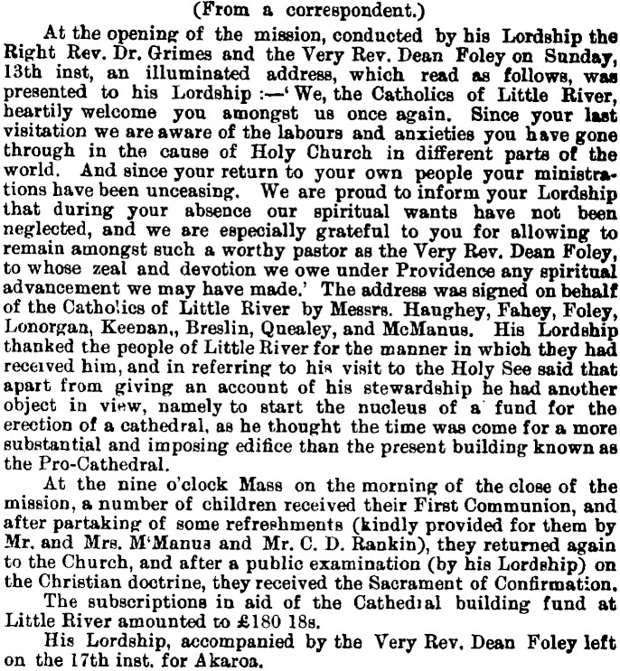 (From a correspondent.) At the opening of the mission, conducted by his Lordship the Right Rev. Dr. Grimes and the Very Rev. Dean Foley on Sunday, 13th inst, an illuminated address, which read as follows, was presented to his Lordship :— ' We, the Catholics of Little River, heartily welcome you amongst us once again. Since your last visitation we are aware of the labours and anxieties you have gone through in the cause of Holy Church in different parts of the world. And since your return to your own people your ministrations have been unceasing. We are proud to inform your Lordship that during your absence our spiritual wants have not been neglected, and we are especially grateful to you for allowing to remain amongst such a worthy pastor as the Very Rev. Dean Foley, to whose zeal and devotion we owe under Providence any spiritual advancement we may have made.' The address was signed on behalf of the Catho'.ics of Little River by Messrs. Hanghey, Fahey, Foley, Lonorgan, Keenan,, Breslin, Quealey, and McManus. His Lordship thanked the people of Little River for the manner in which they had received him, and in referring to hi« visit to the Holy See said that apart from, giving an account of his stewardship he had another object in vi«w, namely to start the nucleus of a fund for the erection of a cathedral, as he thought the time was come for a more substantial and imposing edifice than the present building known as the Pro-Cathedral. At the nine o'clock Mass on the morning of the close of the mission, a number of children received their First Communion, and after partaking of some refreshments (kindly provided for them by Mr. and Mrs. M'Manua and Mr. C. D. Rankin), they returned again I to the Church, and after a public examination (by his Lordship) on the Christian doctrine, they received the Sacrament of Confirmation. The subscriptions in aid of the Cathedial building fund at Little River amounted to £180 18s. His Lordship, accompanied by the Very Rev. Dean Foley left on the 1 7th inst. for Akaroa.