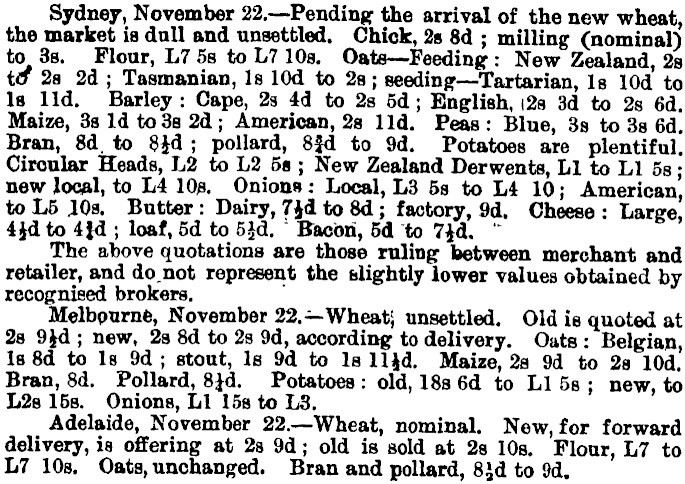 Sydney, November 22.— Pending the arrival of the new wheat, the market is dull and unsettled. Chick, 2s 8d ; milling (nominal) to 3s. Flour, L7ssto L 7 10s. Oats— Feeding : New Zealand, 2s to 2s 2d ; Tasmanian, Is lOd to 2s ; seeding — Tartarian, Is lOd to Is lid. Barley : Cape, 2a 4d to 2s sd ; English, i2s 3d to 2s 6d. Maize, 3s Id to 3s 2d ; American, 2s lid. Peas : Blue, 3s to 3s 6d. Bran, Bd. to B£d ; pollard, Bfd to 9d. Potatoes are plentiful. Circular Heads, L 2 to L 2 5s ; New Zealand Derwents, Ll to Ll 5s • new local, to L 4 10s. Onions : Local, L 3 5s to L 4 10 ; American, to L 5 JOs. Butter : Dairy, 7Jd to 8d ; factory, 9d. Cheese : Large, 4 Jd to 4fd ; loaf, 5d to s£d. ; Bacon, 5d to 7*d. " The above quotations are those ruling between merchant and retailer, and do.not represent the slightly lower values obtained by recognised brokers. Melbourne, November 22.— Wheat; unsettled. Old is quoted at 2s 9Jd ; new, 2s 8d to 2s 9d, according to delivery. Oats : Belgian, Is 8d to Is 9d ; stout, Is 9d to Is lljd. Maize, 2s 9d to 2s lOd. Bran, Bd. Pollard, BJd. Potatoes : old, 18s 6d to Ll 5s : new, to L2s 15s. Onions, Ll 15s to L 3. Adelaide, November 22.— Wheat, nominal. New, for forward delivery, is offering at 2s 9d ; old is sold at 2s 10s. Flour, L 7 to L 7 10s. Oats, unchanged. Bran and pollard, BJd to 9d.