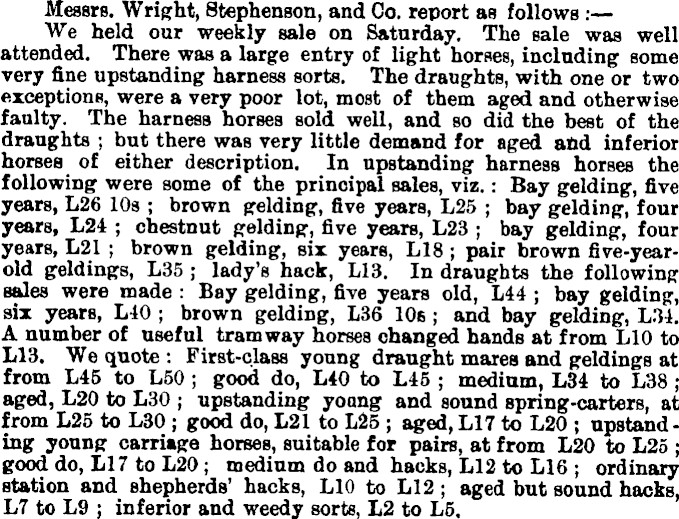 Messrs. Wright, Btephenson, and Co. report as follows :—: — We held our weekly sale on Saturday. The sale was well attended. There was a large entry of light horses, including some very fine upstanding harness sorts. The draughts, with one or two exceptions, were a very poor lot, most of them aged and otherwise faulty. The harness horses sold well, and so did the best of the draughts ; but there was very little demand for aged and inferior horses of either description. In upstanding harness horses the following were some of the principal sales, viz. : Bay gelding, five years, L 26 10s ; brown gelding, five years, L 25 ; bay gelding, four years, L 24 ; chestnut gelding, five years, L 23 ; bay gelding, four years, L2l ; brown gelding, six years, LlB ; pair brown five-year-old geldings, L 35 ; lady's hack, LI 3. In draughts the following sales were made : Bay gelding, five years old, L 44 ; bay gelding, six years, L4O ; brown gelding, L 36 10s ; and bay gelding, L 34. A number of useful tramway horses changed hands at from LlO to Ll3. We quote : First-class young draught mares and geldings at from L 45 to LSO ; good do, L4O to L 45 ; medium, L 34 to L3B ; aged, L2O to L3O ; upstanding yoang and sound Bpring-carters, at from L 25 to L3O ; good do, L2l to L 25 ; aged, Ll7 to L2O ; upstanding young carriage horses, suitable for pairs, at from L2O to L 25 ; good do, LI 7to L2O ; medium do and hacks, Ll2 to Ll6 ; ordinary station and shepherds' hacks, LlO to Ll2 ; aged but sound hacks, L 7 to L 9 ; inferior and weedy sorts, L 2 to L 5.