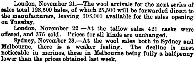London, November 21. — The wool arrivals for the next series of sales total 123,500 bales, of which 25,500 will be forwarded direct to the manufacturers, leaving 105,000 available for the sales opening on Tuesday. London, November 22 —At the tallow Bales 421 casks were offered, and 375 sold. Prices for all kinds are unchanged. Sydney, November 23. — At the wool sales both in Sydney and Melbourne, there is a weaker feeling. The deoline is most noticeable in merinos, these in Melbourne being fully a halfpenny lower than the prices obtained last week.