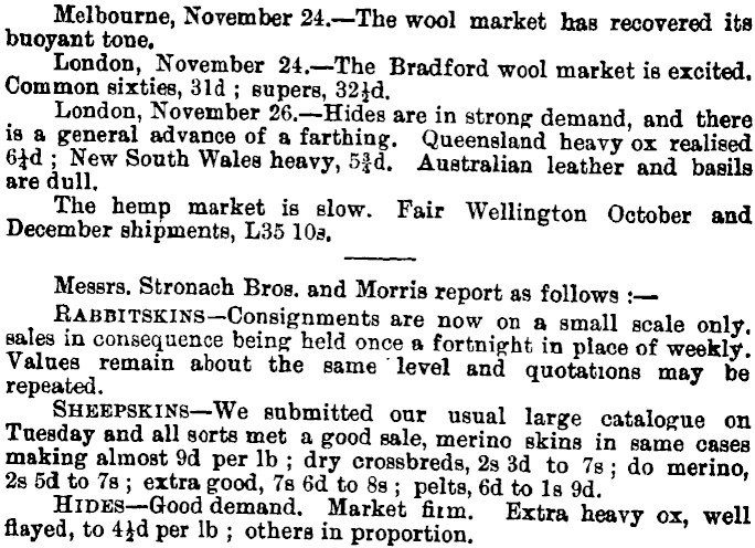 Melbourne, November 24.— The wool market h&B recovered its buoyant tone. London, November 24.— The Bradford wool market is excited. Common sixties, 31d ; Bupers, 32Jd. London, November 26.— Hides are in strong demand, and there is a general advance of a farthing. Queensland heavy ox realised 6*d ; New South Wales heavy, s£d. Australian leather and basils are dull. The hemp market is slow. Fair Wellington October and December shipments, L 35 10a. Messrs. Stronach Bros, and Morris report as follows :— Rabbitskins— Consignments are now on a small scale only sales in consequence being held once a fortnight in place of weekly Values remain about the same level and quotations may be repeated. Sheepskins— We submitted our usual large catalogue on Tuesday and all sorts met a good sale, merino skins in same cases making almost 9d per lb ; dry crossbreds, 2s 3d to 7s ; do merino, 2s 5d to 7s ; extra good, 7s 6d to 8s ; pelts, 6d to Is 9d. fl ?? E^ G°odG ° 0d^ em ?? d - . Markefc fiim - Extra h eavy ox, well nayea, to 4Jd per lb ; others in proportion.