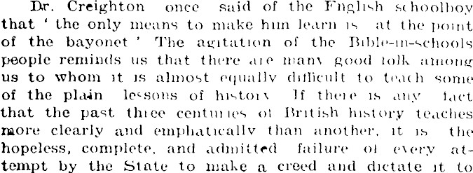 Dr. Creighton once said of the English sihoolboy that ' the only means to make him learn is at the point of the bayonet ' The agitation of the Bible-m-schools people reminds us that there aio inanv good lo)k among us to whom it is almost equally diflicult to teach some of the plain lessons of histoiv If theie is any tact that the past thiee centimes ol British history teaches more clearly and emphatically than another, it is the hopeless, complete, and admitted failure ol vwvy attempt by the State to make a creed and dictate it to