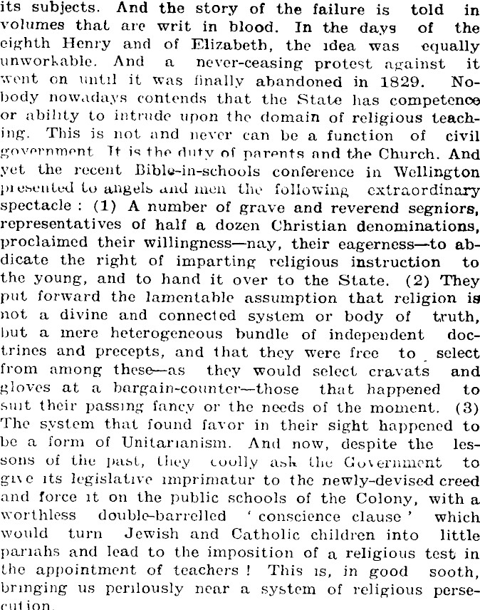 its subjects. And the story of the failure is told in volumes that arc writ in blood. In the days of the eighth Henry and of Elizabeth, the idea was equally unworkable. And a never-ceasing protest against it wont on until it was finally abandoned in 1829. Nobody nowadays contends that the State has competence or ability to intrude upon tho domain of religious teaching. This is not and never can be a function of civil government Tt is tho duty of parents nnd the Church. And yet the recent Biblu-in-schools conference in Wellington piosenleU to angels and men the following extraordinary spectacle : (1) A number of grave and reverend segniore, representatives of half a dozen Christian denominations, proclaimed their willingness — nay, their eagerness — to abdicate the right of imparting religious instruction to the young, and to hand it over to the State. (2) They put forward the lamentable assumption that religion ia not a divine and connected system or body of truth, but a mere heterogeneous bundle of independent doctrines and precepts, and that they were free to select from among these — as they would select cravats and gloves at a bargain-counter — those that happened to suit their passing fancy or the needs of the moment. (3) The system that found favor in their sight happened to be a form of Unitananism. And now, despite the lessons of the past, they coolly ask the Government to gi\e its legislative imprimatur to the newly-devised creed and force it on the public schools of the Colony, with a worthless double-barrelled ' conscience clause ' which would turn Jewish and Catholic children into little pariahs and lead to the imposition of a religious test in tho appointment of teachers ! This is, in good sooth, bringing us perilously near a system of religious persecution.