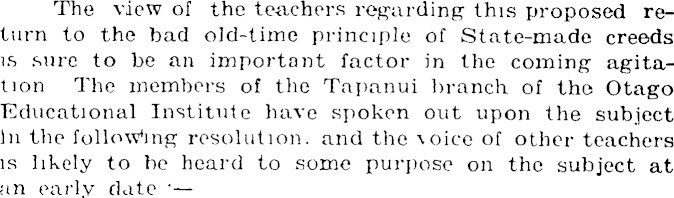 The view of the teachers regarding this proposed return to the bad old-time principle of State-made creeds is sure to be an important factor in the coming agitation The members of the Tapanui branch of the Otago Educational Institute have spoken out upon the subject In the following resolution, and the voice of other teachers is likely to be heard to some purpose on the subject at an early date ' —
