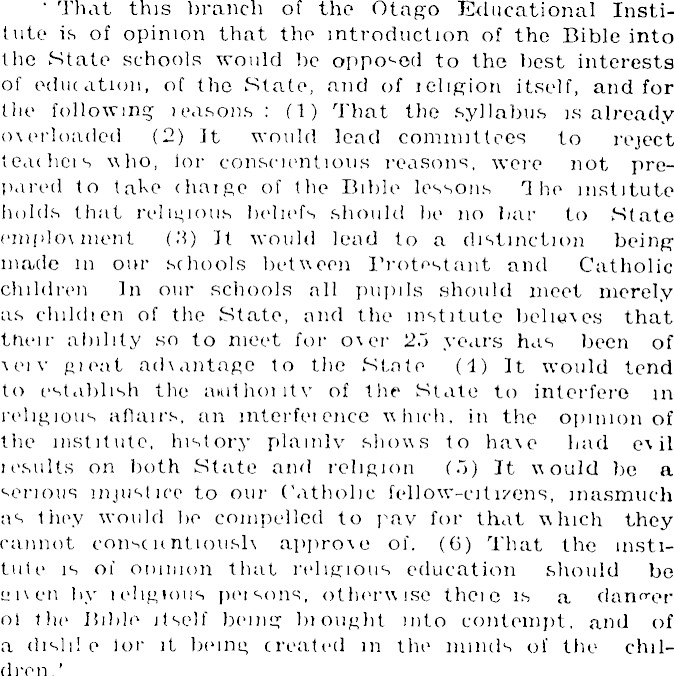 " That this branch of the Otago Educational Institute is of opinion that the introduction of the Bible into the State schools would be opposed to the best interests of education, of the State, and of icligion itself, and for the following leasons: (1) That the syllabus is already overloaded (2) It would lead committees to reject 'cachets who, lor conscientious reasons, were not prepared to take chaige of the Bible lessons The institute holds that religious beliefs should be no liar to State employment (.'s) It would lead to a distinction being made in our schools between Protestant and Catholic children In our schools all pupils should meet merely as childien of the State, and the institute belitnes that their ability so to meet for over 2.5 years has been of veiv gieat advantage to the State (4) It would tend to establish the amthoiitv of the State to interfere in religious afuurs, an interference which, in the opinion of the institute, history plamlv shows to have had evil Jesuits on both State and religion (.">) It would be a serious injustice to our Catholic fcllovv-citi/ens, inasmuch as they would be compelled to pay for that which they cannot conscicntiouslv approve of. (6) That the institute is of onmion that religious education should be uncn by lehgioiis persons, otherwise thcic is a danger ol the Bible itself being- bi ought into contempt, and of a dish! c lor it being created in the minds of the children.'