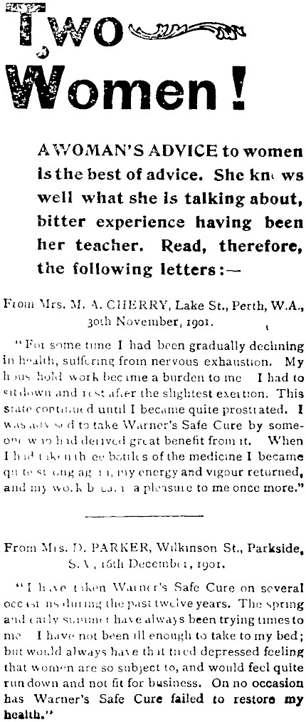 A WOMAN'S ADVICE to women Is the best of advice. She kni ws well what she is talking about, bitter experience having been her teacher. Read, therefore, the following letters: — Fiom Mrs. M. A. CHERRY, Lake St., Perth, W.A., 3<xh November, iqoi. , " Foi sometime I had been gradually declining in h"jlih, suffering from nervous exhaustion. My h ni>, holil work bee mie a burden to me I had to "Mtilnwn ,md icst ciLcr the slightest exeit ion. This stato coptii.ui d until I beccune quite prosttated. I w,\b .1.1 v si <i to take Warner's Safe Cure by someo"i wnli vi ileiivcd great benefit from it. When I b iH i iki ii ih er bottlts of the medicine I became qu d' <v (,ng ag 1 i, piy energy and vigour returned, and iii> wo. Kb lj. 1 a pk'isuic to me once more." From Mis. T). PARKER, Wilkinson St., Parkside, S. \ , iSth Dijcembc i, iyoi. "I h.\f> t iKen Warner's Safe Cure on several occi-,1 ns ilui im; the p. ist twelve years. Tim spring an.l tailv si, mini 1 ha\e alwajs been trying times to me I h.ivc not been ill enough to take to my bed; but would always ha\ c th it tn ed depressed feeling that worivn are so subject to, and would feel quite rundown and not fit for business. On no occasion has Warner's Safe Cure failed to restore my health."