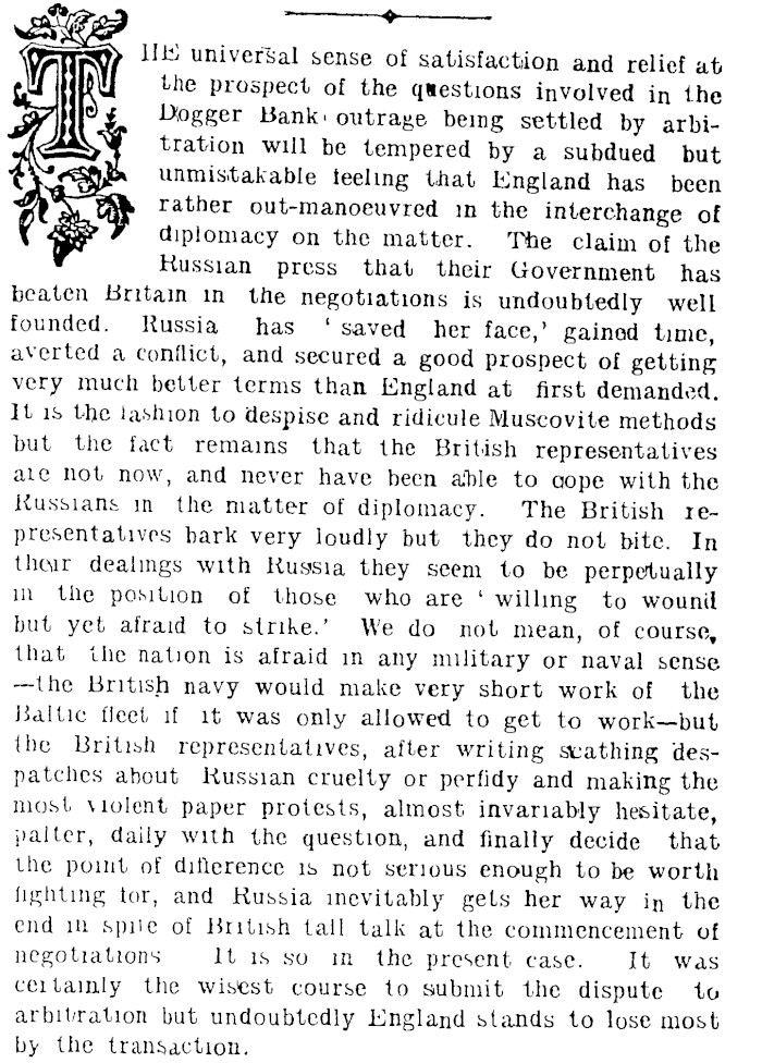 §j* HE universal sense of satisfaction and relief at II the prospect of the qtestions involved in the f Dlogger Bank . outrage being settled by arbinT tration will be tempered by a subdued but Jk unmistakable ieehng that England has been Sk rather out-manoeuvred in the interchange of T diplomacy on the matter. The claim of the » Kussian press that their Government has beaten Britain in the negotiations is undoubtedly well founded. Russia has ' saved her face,' gained time, averted a conflict, and secured a good prospect of getting very much belter terms than England at first demanded. It is the la.shion to aespise and ridicule Muscovite methods but the fact remains that the British representatives aie not now, and never have been able to oope with the Kussians in the matter of diplomacy. The British representatives bark very loudly but they do not bite. In their dealings with Kuasia they seem to be perpetually in the position of those who are ' willing to wounil but yet afraid to strike.' We do not mean, of course, that the nation is afraid in any military or naval sense —the British navy would make very short work of the Baltic fleet if it was only allowed to get to work— but the British representatives, after writing stathing despatches about Kussian cruelty or perfidy and making the most, violent paper protests, almost invariably hesitate, palter, daily with the question, and finally decide that the point of difference is not serious enough to be worth lighting tor, and Russia inevitably gets her way i n the end m spue of British tall talk at the commencement of negotiations It is so in the present case. It was ceitainly the wisest course to submit the dispute to arbitration but undoubtedly England stands to lose most by the transaction.