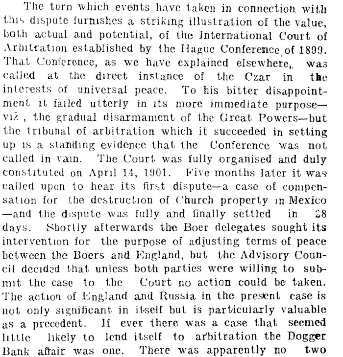 The turn which events have taken in connection with this dispute furnishes a striking illustration of the value, both actual and potential, of the International Court of Arbitration established by the Hague Conference of 1899. That Conference, as we have explained elsewhere,, was called at the direct instance of the Czar in the interests of universal peace. To his bitter disappointment it failed utterly in its more immediate purpose — \u, , the gradual disarmament of the Great Powers— but the tribunal of arbitration which it succeeded in setting up is a standing evidence that the Conference was not called in vain. The Court was fully organised and duly constituted on April 14, 1901. Five months later it was called upon to hear its first dispute — a case of compensation for the destruction of Church property m Mexico —and the dispute was fully and finally settled in 28 days. Shortly afterwards the Boer delegates sought its intervention for the purpose of adjusting terms of peace between the Boers and England, but the Advisory Council decided that unless both parties were willing to submit the case to the Court no action could be taken. The action of England and Russia in the present case is not only significant in itself but is particularly valuable as a precedent. If ever there was a case that seemed little likely to lend itself to arbitration the Dogger Bank afrair was one. There was apparently no two