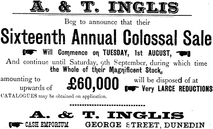Beg to announce that their Sixteenth Annual Colossal Sale V*~ Will Commence on TUESDAY, Ist AUGUST, ~V| And continue until Saturday, 9th September, during which time the Whole of their Njagryficent StocK, amounting to X>ftfl 000 will be disposed of at upwards of <*lUU,UUU l*r Very LARGE REDUCTIONS CATALOGUES may be obtained on application. l^f CASH EMPOSITW GEORGE STREET, DUNEDIN