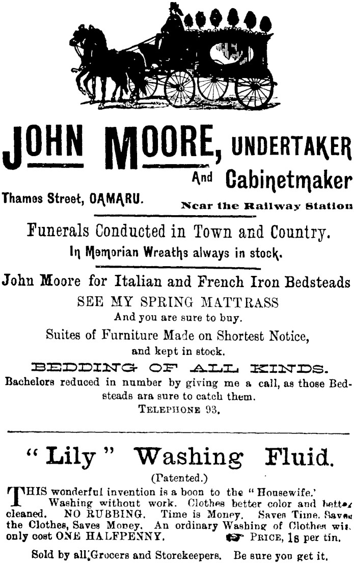 JOHN MOORE, UNDERTAKER A nd Cabinetmaker Thames Street, P^RU. Xcar the Ra|lway Btation Funerals Conducted in Town and Country. Iq N|Bnprian Wreaths always in stocl^. John Moore for Italian and French Iron Bedsteads SEE MY SPRING MA.TTRASS And you are sure to buy. Suites of Furniture Made on Shortest Notice, and kept in stock. BEZDIDIIfcTGr- OP -A-ZLOLi IZIiTIDS. Bachelors reduced in number by giving me a call, as those Bedsteads ara sure to catch them. Telephone 93. "Lily" Washing Tluid. (Patented.) THIS wonderful invention is a boon to the " Housewife.' Washing without work. Clothfls better color and >«ett*v cleaned. NO RUBBING. Time is Money. Saven Time. ftav«« the Clothee, Saves Money. An ordinary Washinar of Clothen wii, only cost ONE HALFPENNY. O» Price, Is per tin. Sold by all' Grocers and Storekeepers. Be sure yon get it.