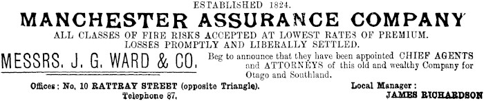 ESTABLISHED 1824. MANCHESTER ASSURANCE COMPANY ALL CLASSES OF FIBE RISKS ACCEPTED AT LOWEST RATES OF PREMIUM. LOSSES PROMPTLY AJSD LIBERALLY SETTLED. MCO 0D 0 I P \A/ AD H 9, PC\ Beg to announce that they have been appointed CHIEF AGENTS IVILOOnOi J. U. YYAnU 06 UUi and ATTORNEYS of this old and wealthy Company for Otago and Southland. Offices ; No, 10 RATTRAY STREET (opposite Triangle). Local Manager : Telephone 87, JAMES RICHARDSON
