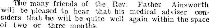 The. many friends of the Rev. Father Ainsworth will be pleased to hear that his medical adviser considers that) ho will be quite well again within the space of two or three months.