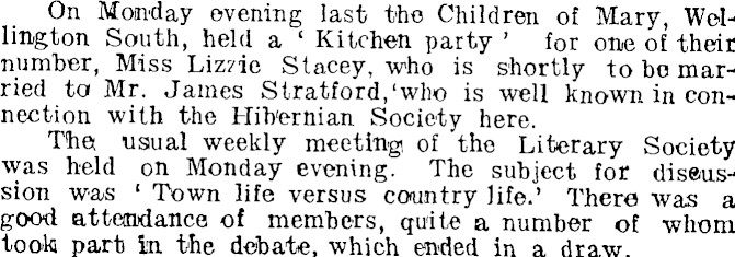 On Monday evening last the Children of Mary, Wellington South, held a ' Kitchen party ' for one of their number, Miss Liz?ie Stacey, who is shortly to bo married to Mr. James Stratford, 'who is well known in connection with the Hibernian Society here. The, usual weekly meeting of the Literary Society was held on Monday evening. The subject for disaussion was ' Town life versus country life.' There was a good attendance of members, quite a number of whom took part in the debate, which ended in a draw.