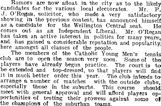 Rumors are now afloat in the city as to the likely candidates for the various local electorates. Mr. P, J. O'Regiaai, solicitor, who made a very satisfactory showing in the previous contest, has announced himself as a, candidate for the Wellington Central seat. He comes out as an Independent Liberal. Mr. O'Regan ha;a taken an active interest in politics for many years 1 ,, and, (has gained a considerable replication and popularity, here amongst all classes of the people. The members of the Catholic Yo<ung Men's tennis club are to open the season very soon. Some of the players have already begun practice. The court is to be extended and top-dressed, so that players will find it in mueli better order this yea*. The club intends to arrange a number of matches with the outside clubs-, especially those in the suburbs. This course should meet with general approval and will afford players opportunities of testing their prowess against some of the champions! of the suburban teams.