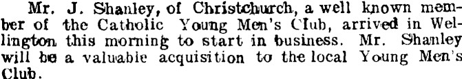 Mr. J. Shanley, of Chri9tchiurch, a well known member of the Catholic Young Men's Club, arrived in Wellington this morning to start in business. Mr. Shanley will be a valuable acquisition to the local Young Men's Club.