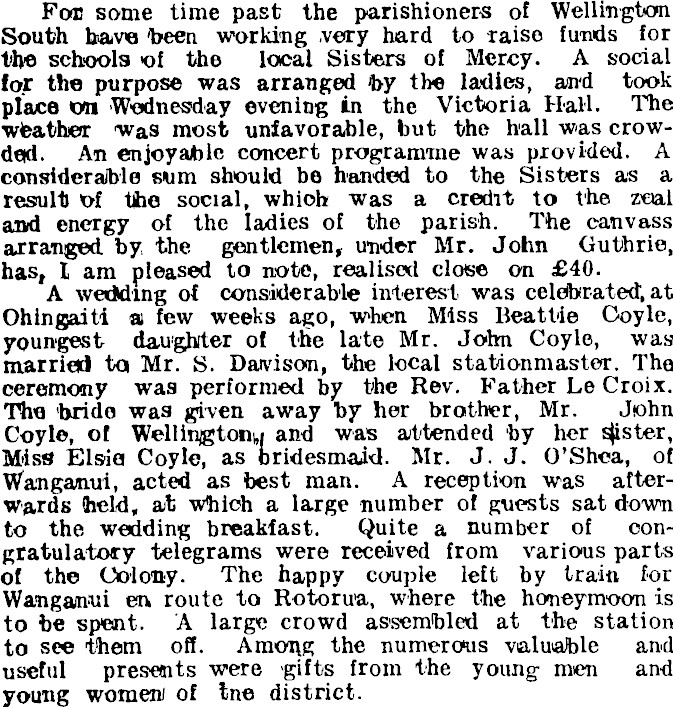 For some time past the parishioners of Wellington South have 'been working very hard to raise funds for the schools <of the local Sisters of Mercy. A social for the purpose was arranged by the ladies, and took place on Wednesday evening in the Victoria Hall. The weather was most unfavorable, but the hall was crowded. An enjoyable concert programme was provided. A considerable sum should be handed to the Sisters as a result of tihe social, whioh was a credit to the z«al and energy of the ladies of the parish. The canvass arranged by the gentlemen, under Mr. John Guthrie, has, I am pleased to note, realised close on £40. A wedding ol considerable interest was celebrated; at Ohingaitl a few weeks ago, when Miss Beat tie Ooyle, youngest daughter of the late Mr. John Coyle, was married to Mr. S. Daivison, the local station master. The ceremony was performed by the Rev. Father Le Croix. The bxido was given away by her brother, Mr. J»hn Coyle, of Wellinjgtoni,! and was attended by her sjister, Miss Elsia Coyle, as bridesmaid. Mr. J. J. O'Shea, of Wanganui, acted as best man. A reception was afterwards (held, at which a large number of guests sat down to the wedding breakfast. Quite a number of congratulatory telegrams were received from various parts of the Colony. The happy couple left by train for Wangawui en route to Rotoruu, where the honeymoon is to be spent. A large crowd assembled at the station to see them off. Amon.g the numerous valuable and useful presents were gifts from the young men and young women/ of tne district.