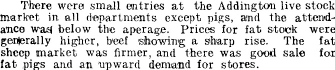 There were small entries at the Addington live stock market in all departments except pigs, and the attendance wa4 below the aperage. Prices for fat stock were generally higher, beef showing a sharp rise. The fat sheep market was firmer, and there was good sale far fat pigs and an "upward demand for stores.