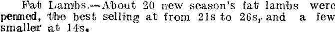 Fart Lambs.— About 20 new season's fat lambs were penmod, I*o best selling at from 21s to 265,. and a few smaller at 14's«