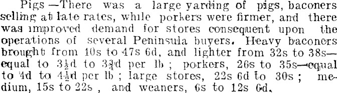 Pigs —There was a large yarding of pags, baconers selling at late rates, while porkers were firmer, and there waa improved demand for stores conseqiuent upon the operations of several Peninsula buyers. Heavy buconors brought from 10s to 47s Gd, and lighter from 32s to 38s— equal to 3|d to 3|'d per lb ; porkers, 26s to 35s— 'eqfiial to '4d to 4-Aci per \h ; large stores, 22s Gd to 30's ; medium, 15s to 22s , and weaners, 6s to 12s &d.