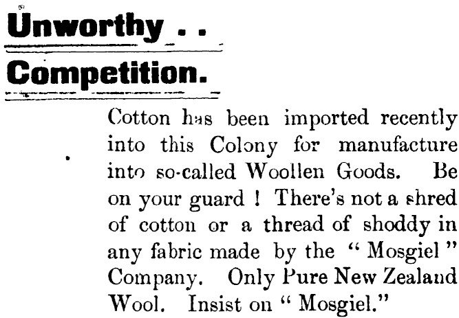 Unworthy ■ . Competition. Cotton has been imported recently into this Colony for manufacture into so-called Woollen Goods. Be on your guard 1 There's not a shred of cotton or a thread of shoddy in any fabric made by the " Mosgiel " Company. Only Pure New Zealaud Wool. Insist on " Mosgiel."