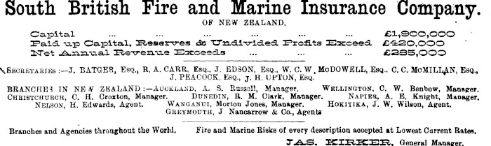 South British Fire and Marine Insurance Company. OF NEW ZEALAND. Capital ... ... ... ... ... ... £1,900,000 rstid. -o.p Oa.pita.l, Sfceserrres «Sc TTaa.a.i"srl<a.ed. aProfi/ts EacceecL £-420,000 ZSTet .A.M.M.-aa.l 3R.e-\re».-u.e Exceeds ... ... ... £285,000 \Sjsceetabies :— J. BATGER, Esq., R. A. CARR, Esq., J. ED3ON, Esq., W. C. W, MoDOWELL, Esq.. C. C. MoMILLAN. Esq., J. PEACOCK, Esq., j. H. UJPTON, Esq. BRANCHED IN NE V ZEALAND :— Auckland, A. S. Russell, Manager. Wellington, 0. W. Benbow, Manager. Chbistchukoh, C. H. Croxton, Manager. Dunedin, R. M. Clark, Manager. Napier, A. E. Knight, Manager. Nelson, H. Edwards, Agent. Wanganui, Morton Jones, Manager. Hokitika, J. W. Wilson, Agent. Gbeymouth, J Nanoarrow & Co., Agents Branches and Agenoies throughout the World. Fire and Marine Risks of every description accepted at Lowest Current Rates. T-A.S. ZZZ£%ZCS£%, General Manager.